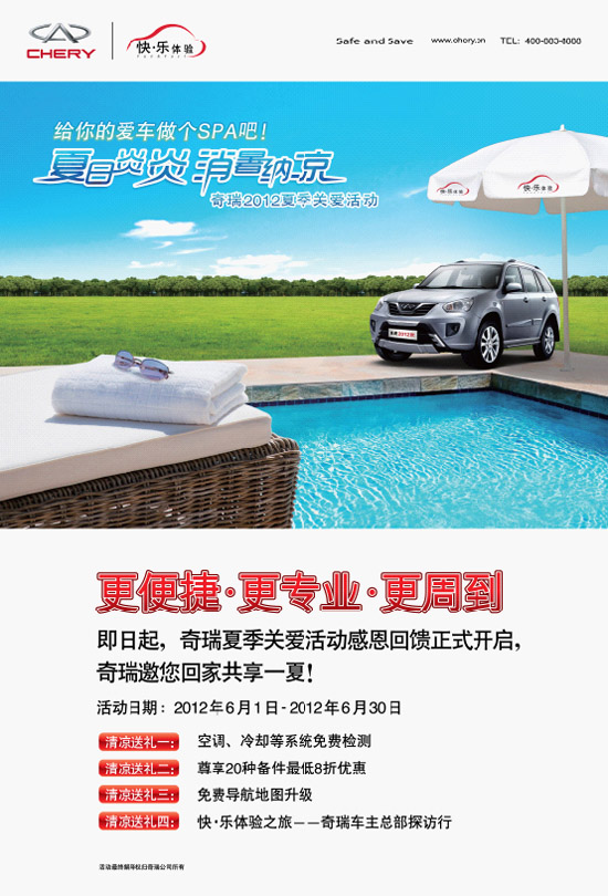 據(jù)悉活動期間,凡奇瑞用戶進站參與活動,即可享受到愛車空調(diào)、冷卻系統(tǒng)等免費檢測服務(wù),空調(diào)濾芯、雨刮片等夏季常用20余種備件最低8折優(yōu)惠,此外,2011年購奇瑞“好幫手”原裝DVD導(dǎo)航的車主,也將享受到免費的地圖升級服務(wù)。