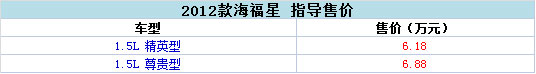 6月4日,2012款海馬海福星正式上市。新車搭載與老款相同的1.5L發(fā)動機,而根據(jù)配置差異,新車有兩款車型可選。2012款海福星的市場指導價為6.18-6.88萬元。具體售價見下表: