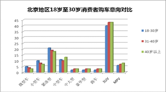 據(jù)2011年,一項(xiàng)針對(duì)北京市場(chǎng)18歲-40歲以上購(gòu)車(chē)者的調(diào)查顯示,年齡在31歲至40歲的用戶對(duì)于SUV的購(gòu)買(mǎi)意向更強(qiáng),明顯要高于比18歲至30歲用戶。而且不同于購(gòu)買(mǎi)第一輛的年輕人,那么看重車(chē)輛的外觀與內(nèi)飾;許多準(zhǔn)備置換購(gòu)車(chē)的老車(chē)主,則基于多年的親身用車(chē)經(jīng)驗(yàn),更強(qiáng)調(diào)車(chē)輛的“實(shí)用性能力”,品質(zhì)好,結(jié)實(shí)耐用、空間寬敞、油耗低…..才是他們最為關(guān)心的問(wèn)題。