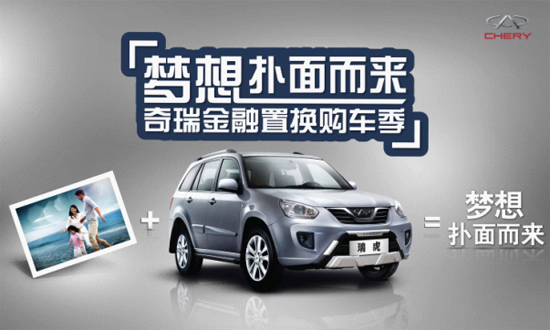 為能減少消費(fèi)者在舊車(chē)處理時(shí)的經(jīng)濟(jì)損失,目前奇瑞還特別推出“夢(mèng)想撲面而來(lái)--奇瑞瑞虎金融置換季”大型活動(dòng)。
