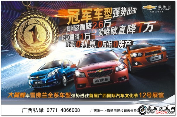 2012年6月15至18日廣西國(guó)際汽車文化節(jié)將在南寧國(guó)際會(huì)展中心隆重舉行。本次車展弘澤雪佛蘭科魯茲冠軍版、愛(ài)維歐冠軍版、新賽歐冠軍版強(qiáng)勢(shì)出擊,最高鉅惠30000元。送豪華特選禮包+1年重要部件延保。弘澤雪佛蘭所在南寧國(guó)際會(huì)展中心12號(hào)展館等候車友們前來(lái)賞車購(gòu)車,并且現(xiàn)場(chǎng)有冷飲,水果和甜點(diǎn)提供。