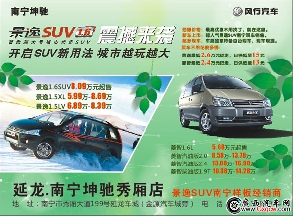 從現(xiàn)在起,到南寧坤馳店購(gòu)風(fēng)行全系車型,即享受我店用車展的參展成本讓利,也就是說(shuō)購(gòu)車不止享受平時(shí)的優(yōu)惠,還可獲得車展參展