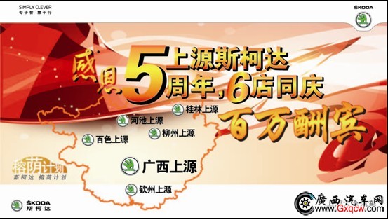 廣西上源斯柯達感恩5周年,6店同慶,百萬酬賓!6月廣西上源斯柯達也將加入上海大眾汽車“榕蔭計劃”,助力消費者早日輕松圓夢有車生活。