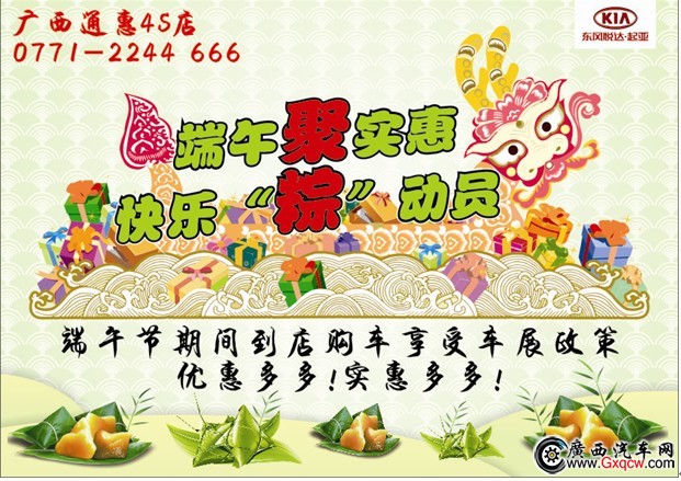 6月23、24日,東風(fēng)悅達起亞南寧通惠全系車型端午購車,快樂“粽”動員,優(yōu)惠總動員,延續(xù)車展政策,K5最高鉅惠3.5萬元,獅跑最高現(xiàn)金優(yōu)惠2.5萬元,福瑞迪8.38萬起。除了購車優(yōu)惠之外,活動期間訂購車有豪禮相送。地址:南寧市白沙大道69號(白沙南建路口),詳詢0771-2244 666。