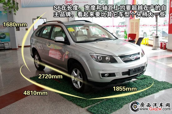 車身尺寸方面,比亞迪S6為4810*1855*1680mm,軸距為2720mm,除了軸距略短,其余尺寸也已經(jīng)達(dá)到了合資中型SUV的水平。