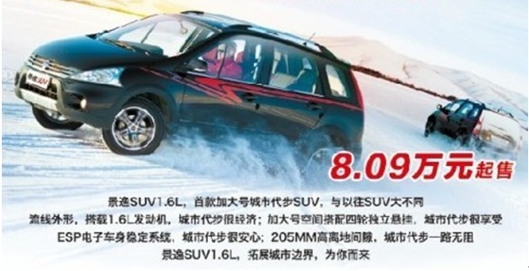 景逸SUV,定位于“城市代步SUV”,力爭讓SUV成為普通城市家庭的第一輛車,以SUV大空間、運動性、高通過性等車型優(yōu)勢改善人們的代步生活,同時過濾掉傳統(tǒng)SUV高油耗、高售價等不適應城市代步的元素。從這一思想出發(fā),景逸SUV實現(xiàn)了高舒適性、高通過性、高安全性、低油耗、低噪音、低使用成本等諸多產(chǎn)品優(yōu)勢。其中,低油耗這一突出亮點,在油價“破8”的當前,尤其受到消費者歡迎。