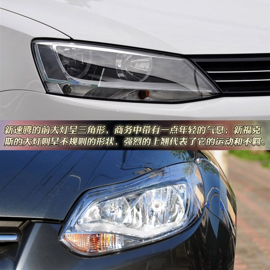 在造型方面,作為前臉上的點(diǎn)睛之筆,新速騰和新?怂沟拇鬅舳即砹藘烧咴陲L(fēng)格上的不同。新速騰的大燈呈三角形,商務(wù)中帶有一點(diǎn)年輕的氣息;而新?怂沟拇鬅魟t呈不規(guī)則的形狀,強(qiáng)烈的上翹代表了它的運(yùn)動(dòng)和不羈。
