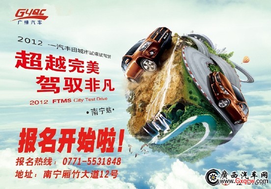 2012年7月7日-8日,2012一汽豐田城市試乘試駕營將于南寧市火熱上演,本次活動(dòng)由一汽豐田廠家全力打造。您希望實(shí)際操控卡羅拉體驗(yàn)他的動(dòng)感輕盈?還是親身坐乘感受RAV4的狂野魅力?或者全面感受皇冠的高雅尊貴的內(nèi)在空間、掌控自如的駕乘感呢?即刻來參加的“一汽豐田城市試乘試駕營”活動(dòng)。在此您不僅能試乘試駕一汽豐田各款經(jīng)典車型,同時(shí),廣緣一汽豐田4S店為參加試駕活動(dòng)并且準(zhǔn)備現(xiàn)場(chǎng)訂車的朋友準(zhǔn)備了購車神秘大禮,活動(dòng)當(dāng)天現(xiàn)場(chǎng)公布,歡暢試駕,邀您尊享!