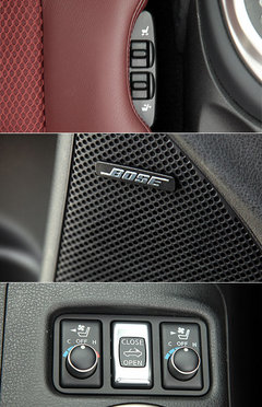 雖然定位為性能跑車,然而370Z Roadster在配置上仍具有一定的水平。中控臺上的7吋彩色觸控屏幕,整合衛(wèi)星導航、恒溫空調、CD音響、藍牙通訊、車輛信息等多樣化功能,并提供全中文化界面,操作起來更加便利易懂。特別就音響系統部份,370Z Roadster除了支持CD、DVD、i-Pod、USB、AUX-IN等多媒體外,本身也內建9.3 GB Music Box硬盤,再搭配音響大廠Bose提供的8具揚聲器組合,可大幅擴充車上娛樂機能。