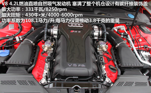 首入國內(nèi)RS車型 百公里加速4.6S 4.2FSI V8高轉(zhuǎn)速引擎 超越寶馬M3轎跑 4.2升8000rpm/420PS/400Nm |