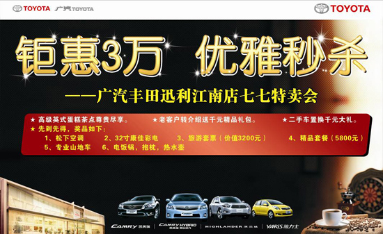 當(dāng)天到迅利江南店訂購(gòu)凱美瑞將享受最高3萬(wàn)的優(yōu)惠。訂車更可以參加搶寶活動(dòng),現(xiàn)場(chǎng)空調(diào)、液晶電視等大禮,按照訂單先到先得。