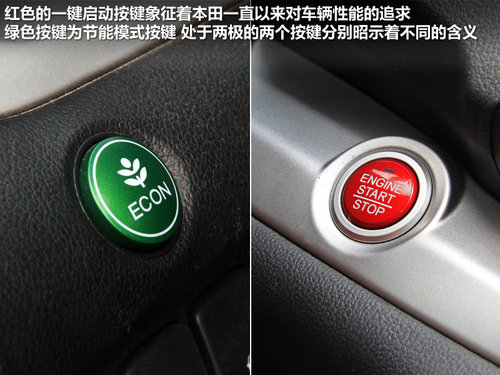 紅和綠,原本是兩個(gè)完全不相干的顏色搭配,它們就像是南極與北極,完全不會有任何交集。但在全新CR-V的中控臺上,你卻可以同時(shí)看到這兩種顏色。紅色的一鍵式啟動(dòng)按鍵,表露了本田一直以來對性能的追崇,綠色的ECO模式按鍵,則是更貼近生活的實(shí)用功能,一冷一熱兩種色調(diào)搭配在這里,卻并不顯得不和諧。