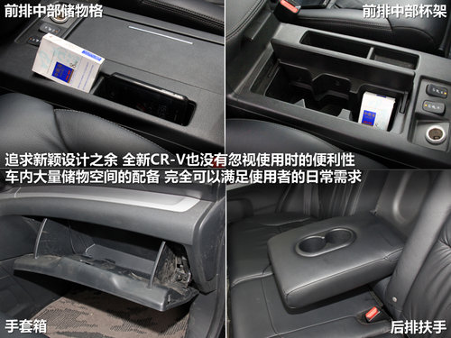SUV車型最無需質(zhì)疑的,便是車內(nèi)的儲物空間,全新CR-V分別為前后排乘客設(shè)計(jì)了大量儲物空間,雖然不像有些SUV那樣,儲物格設(shè)計(jì)的鋪天蓋地,但全新CR-V的精巧設(shè)計(jì),在實(shí)際使用中,卻充分表露出了它對空間利用率的追求。