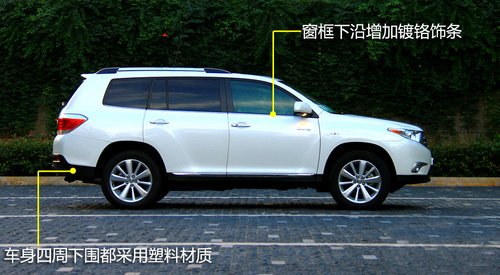 我們拍攝的車輛為白色涂裝,可以明顯看出2012款漢蘭達(dá)在車身下圍采用了黑色塑料的裙邊,稍稍增加一點越野的味道。另外還可以留意恰到好處的鍍鉻點綴,包括裙邊與漆面車身的過渡處、窗框下沿、前后保險杠下側(cè)等等,適當(dāng)?shù)馁F氣但不會顯得粗俗。