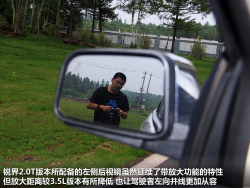 通過之前試駕銳界3.5L版本,這樣三個設計給我留下了很深刻的“印象”,首先是左側(cè)外后視鏡,美國車很喜歡將左側(cè)的后視鏡設計為放大效果,這樣的設計在美國可能很實用,但是并不符合中國國情,駕駛者往往很難分辨左側(cè)車輛與自己的距離,以致不敢并線。所以在上車之前,我就首先查看了一下這項配置是否仍舊存在,雖然它的視覺效果與右側(cè)后視鏡仍舊有些不同,但也已經(jīng)不會再影響駕駛。