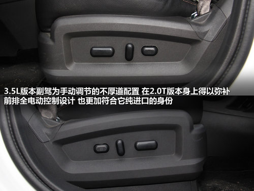 在之前試駕過的3.5L版本身上,我們曾經(jīng)意外的發(fā)現(xiàn)了一項很不厚道的配置,那便是副駕座椅為手動調(diào)節(jié),這樣的設計并不符合這款純進口SUV40萬左右的售價。在2.0T版本身上,這項配置得以彌補,也為使用者提供了更大的便利。