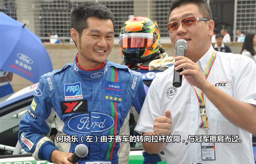 長(zhǎng)安福特車(chē)隊(duì)何曉樂(lè)的賽車(chē)出現(xiàn)機(jī)械故障,停在賽道上,因此賽會(huì)出動(dòng)了安全車(chē)。比賽重新開(kāi)始后,又一場(chǎng)暴雨突至,這樣的情況下駕駛賽車(chē)十分困難。為了車(chē)手的安全,在賽程完成75%(12圈)后賽會(huì)出示紅旗,停止了本場(chǎng)超級(jí)量產(chǎn)車(chē)組的爭(zhēng)奪,同時(shí)也鎖定了韓寒的冠軍位置。