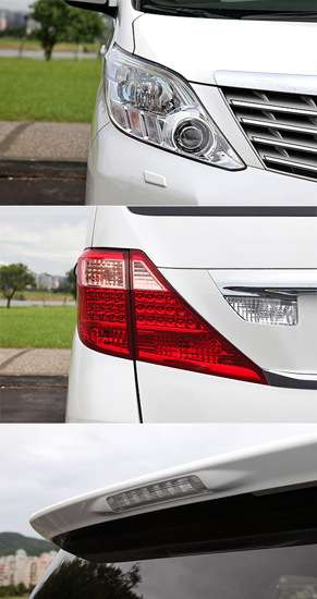 車尾的打造,主要仍舊依循著車頭“V”字型線條鋪成,在尾燈組的造型結(jié)構(gòu)上,佐以一道左右橫跨的鍍鉻飾片,并利用鈑件折痕來加強(qiáng)“V”字線條的存在。一道片狀的后擾流尾翼,除了整合LED第三煞車燈外,內(nèi)隱式的雨刷設(shè)計(jì),亦整合于此。除了“ALPHARD”車尾鍍鉻銘標(biāo)之外,V6車款尚配有一片“V6”銘標(biāo)。