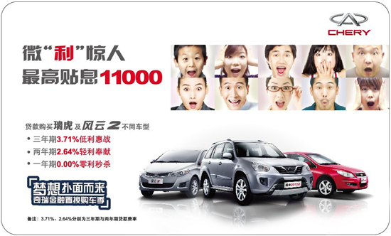 從7月—12月奇瑞汽車年度大型購(gòu)車活動(dòng)——奇瑞微“利”驚人 最高貼息11000 在盛夏火爆開演。想購(gòu)車但手頭緊的朋友不妨趕快來(lái)了解一下,奇瑞幫您輕松實(shí)現(xiàn)有車夢(mèng)想。