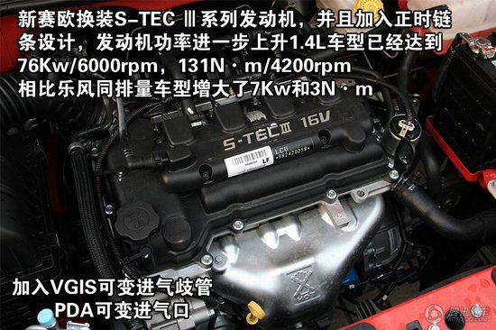 動力方面,新賽歐采用了S-TEC Ⅲ發(fā)動機,相比于樂風的S-TEC Ⅱ有著不小的提升。加入正時鏈條設(shè)計和VGIS可變進氣歧管和PDA可變進氣口,發(fā)動機參數(shù)進一步增強,1.4L車型功率躍升至76Kw/6000rpm,最大扭矩達到131N·m/4200rpm,1.2L 車型則為64Kw/5600rpm,最大扭矩115N·m/4400rpm。