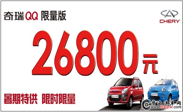 據了解,自今年7月1日起,奇瑞QQ推出限量版車型,售價僅為26800元,以前所未有的優(yōu)惠價格,讓更多消費者有能力享受到奇瑞QQ的經典品質。此款奇瑞QQ限量版車型只在暑期限量供應,是奇瑞QQ獻給廣大消費者的暑期特惠。
