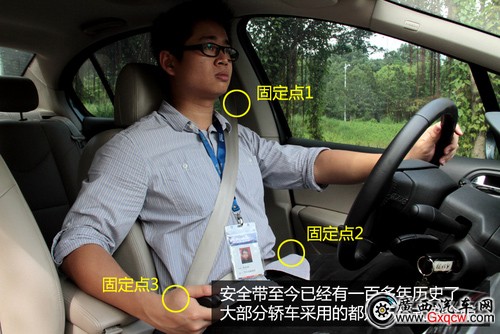 使用安全帶的第一步是調(diào)節(jié)好安全帶肩部的位置。安全帶位置調(diào)節(jié)機構(gòu)位于B住附近,可以上下移動使三點式安全帶適應(yīng)不同身高的駕駛員。