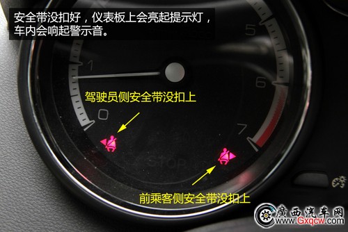 當(dāng)駕乘人員沒有扣上安全帶開動車輛,儀表盤會亮起紅色警告燈,同時車內(nèi)也會響起警示音。