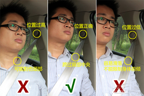 從上圖中我們可以了解到,當(dāng)安全帶肩帶位置太高時,會有可能割傷駕乘人員頸部;而當(dāng)安全帶肩帶位置太低時,安全帶肩帶容易滑落導(dǎo)致無法限制駕乘人員身體前傾。所以在調(diào)節(jié)安全帶高度時,我們應(yīng)使安全帶肩帶跨過我們肩部的中央(如上圖所示)。