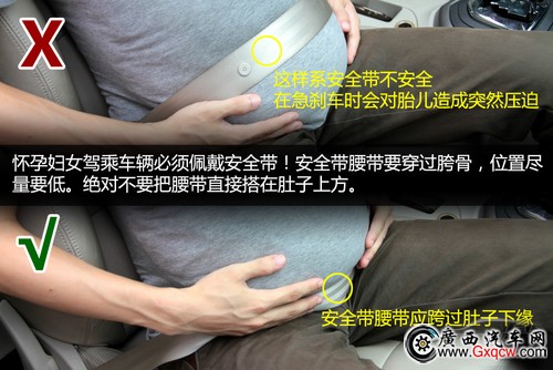 對于孕婦來說,駕乘車輛時必須佩戴安全帶。其實只要保護好孕婦就是對胎兒的最大保護。孕婦在使用安全帶的時候應(yīng)該特別注意腰帶的位置。安全帶腰帶不能搭在肚子上方,而應(yīng)跨在肚子下緣以下(如上圖所示)。肩帶只要跨過胸部中央即可。