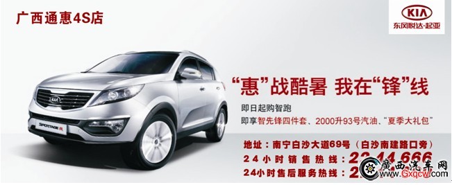 從即日起至7月31日,凡在東風(fēng)悅達(dá)起亞廣西通惠4S店購(gòu)買(mǎi)智跑任一車(chē)型即可獲贈(zèng):“智先鋒四件套”、2000升汽油(93#)及“夏季大禮包”。詳詢(xún)24小時(shí)銷(xiāo)售熱線(xiàn):0771-2244 666,地址:南寧市白沙大道69號(hào)(白沙南建路口)。