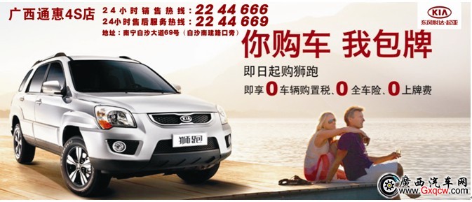 “你購(gòu)車 我包牌”即日起在東風(fēng)悅達(dá)起亞廣西通惠4S店購(gòu)獅跑,即享“0”車輛購(gòu)置稅、“0”全車險(xiǎn)、“0”上牌費(fèi)。詳詢24小時(shí)銷售熱線:0771-2244 666,地址:南寧市白沙大道69號(hào)(白沙南建路口)。