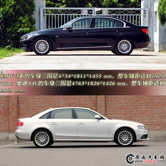 在車身尺寸上,BMW 3系的車身三圍是4734*1811*1455 mm,整車軸距達到2920 mm;奧迪A4L的車身三圍是4763*1826*1426 mm,整車軸距達到2869 mm。