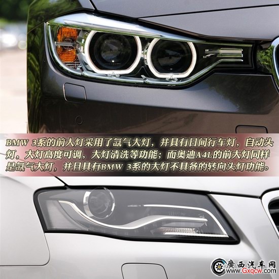 在前大燈方面,BMW 3系的前大燈采用了氙氣大燈,并具有日間行車燈,自動頭燈,大燈高度可調,大燈清洗等功能;而奧迪A4L的前大燈同樣是氙氣大燈,并且在功能上有所超出,不但具有BMW 3系所具有的功能,還具有BMW 3系的大燈不具備的轉向頭燈功能。