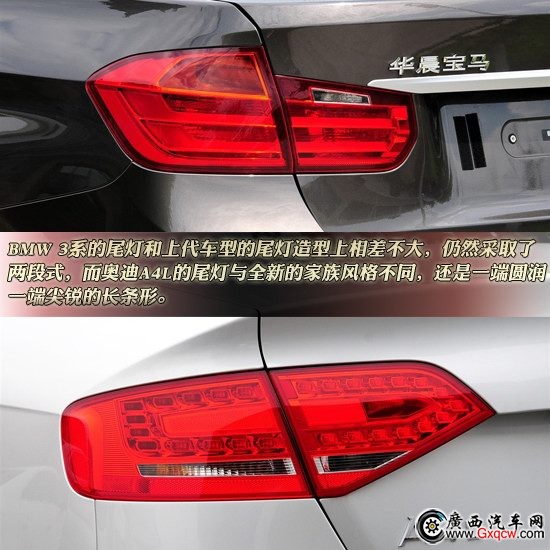 在尾燈方面,BMW 3系的尾燈和上代車型的尾燈造型上相差不大,仍然采取了兩段式,而奧迪A4L的尾燈與全新的家族風格不同,仍然是一端圓潤一端尖銳的長條形。