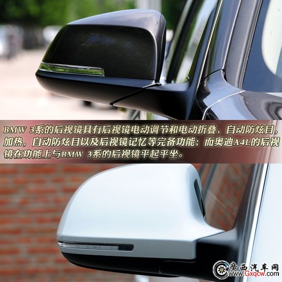 在后視鏡方面,BMW 3系的后視鏡具有后視鏡電動調節(jié)和電動折疊,自動防炫目,加熱,自動防炫目以及后視鏡記憶等完備功能;而奧迪A4L的后視鏡在功能上與BMW 3系的后視鏡平起平坐,畢竟都是豪華品牌的高配車型。在造型上,這兩款車的后視鏡都沒有采用過于夸張的設計,不過從風格上說,還是BMW 3系的后視鏡更具有運動的風格。