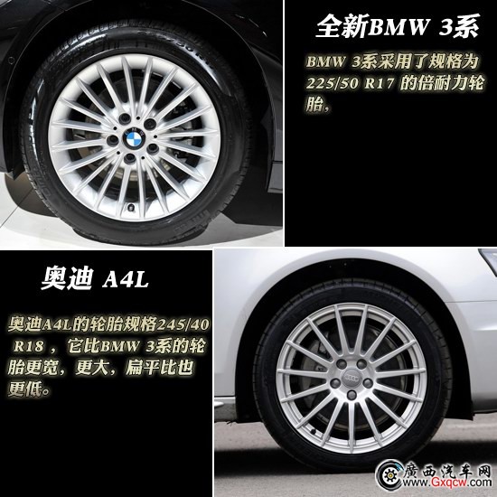在輪胎方面,BMW 3系采用了規(guī)格為225/50 R17 的倍耐力輪胎,而奧迪A4L的輪胎規(guī)格245/40 R18 。我們可以看出奧迪A4L的輪胎更寬,更大,扁平比也更低,但是實際的抓地效果不知是否真的會如規(guī)格一樣,超越BMW 3系的倍耐力輪胎。而兩款車的輪轂都采用了細輻條多輻式,算是英雄所見略同。