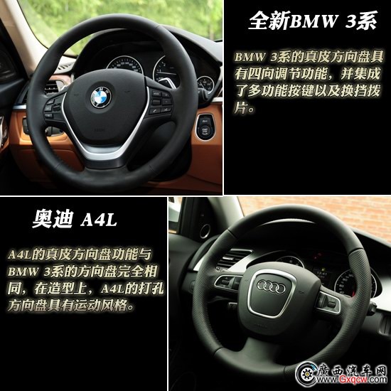 在方向盤方面,BMW 3系的真皮方向盤具有四向調(diào)節(jié)功能,并集成了多功能按鍵以及換擋撥片;A4L的真皮方向盤功能與BMW 3系的方向盤完全相同。只是在造型上它們都是標準的家族造型,A4L的打孔方向盤具有運動風(fēng)格,而BMW 3系的方向盤則更內(nèi)斂。