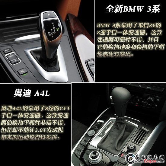 在變速器方面,BMW 3系采用了來自ZF的8速手自一體變速器,這款變速器廣泛應(yīng)用于BMW的各個(gè)車系中,可靠性得到了驗(yàn)證,并且它的換擋速度極快,運(yùn)動(dòng)性能不錯(cuò),并且換擋的平順性也屬優(yōu)秀。奧迪A4L沒有采用7速的雙離合變速器,而是采用了8速的CVT手自一體變速器。這款變速器的換擋平順性非常不錯(cuò),但是卻不能把2.0T發(fā)動(dòng)機(jī)的最高性能發(fā)揮出來,讓A4L這款本來帶有運(yùn)動(dòng)風(fēng)格的車型走了舒適路線。