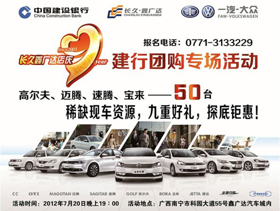 7月20日晚,長久•鑫廣達(dá)一汽-大眾攜手戰(zhàn)略合作伙伴建設(shè)銀行聯(lián)合推出“鑫廣達(dá)店慶九周年建行團(tuán)購專場活動(dòng)”,誠邀建行VIP客戶共享我店九周年成長喜悅,特豪獻(xiàn)九重大禮,感恩眾情: