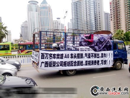 7月17日上午,一輛載著一頭牛并寫(xiě)著標(biāo)語(yǔ)的貨車(chē)行駛在南寧街頭(如圖),這到底是怎么一回事呢?本報(bào)記者打探后得知,今年3月9日,廣西南寧永明珍珠宮珠寶有限公司總經(jīng)理歐育禎駕駛一輛奧迪A8 L3.0轎車(chē)行駛在南寧市青山路時(shí),撞上前面的一輛公交車(chē)導(dǎo)致車(chē)頭撞毀,歐育禎受傷住院10多天。由于事發(fā)時(shí)未見(jiàn)安全氣囊彈出,所以他對(duì)該車(chē)的質(zhì)量提出了質(zhì)疑。經(jīng)過(guò)幾個(gè)月的協(xié)商無(wú)果后,7月17日,在南寧市多部門(mén)的協(xié)調(diào)下,歐育禎與廣西鉅榮汽車(chē)銷(xiāo)售服務(wù)有限公司同意達(dá)成送檢協(xié)議。
