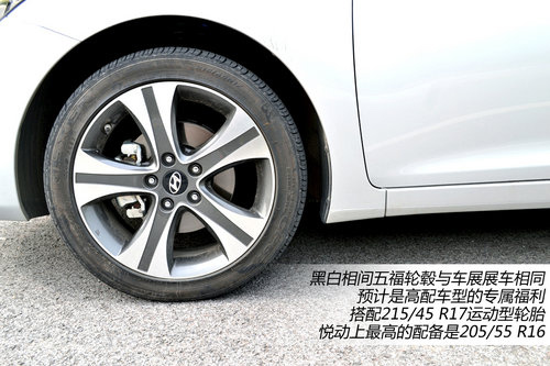 黑白相間的五幅輪轂與車展展車相同,預計是高配車型的專屬福利。實拍朗動搭配了尺寸為215/45 R17的運動型輪胎,要知道在悅動上最高的配備也只是205/55 R16。外后視鏡是個有趣的細節(jié),它與悅動車型上的造型、尺寸一模一樣,在更換配件時可完成無障礙式直接套用。