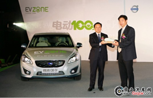 沃爾沃汽車公司研發(fā)副總裁沈峰向上海汽車城領(lǐng)導(dǎo)榮文偉遞交沃爾沃C30純電動車