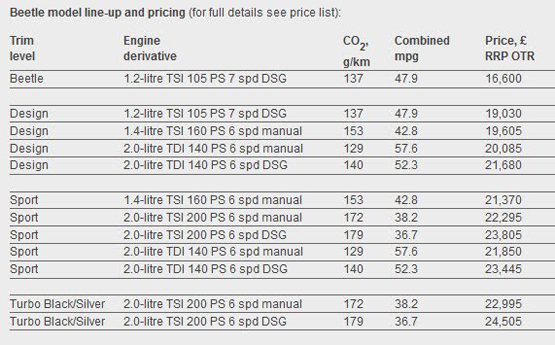 甲殼蟲(chóng)2.0L的TDI款提供運(yùn)動(dòng)版和中型設(shè)計(jì)版本,售價(jià)20085英鎊起;2.0L的TSI也將提供運(yùn)動(dòng)版和中型設(shè)計(jì)版,并新增了銀色渦輪版,售價(jià)22295英鎊起,詳情請(qǐng)見(jiàn)下表。