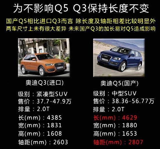 在車身尺寸上,奧迪Q5僅在長度和軸距相比Q3有著明顯的差異。如若Q3在短期內(nèi)進(jìn)行加長,其車身的尺寸長度將于奧迪Q5極為接近,并因其搭載與Q5相同的引擎以及Q3擁有更低的售價(jià)等因素,加之本身奧迪Q3在外形設(shè)計(jì)上就有小Q5的稱謂,綜合以上因素勢(shì)必將影響Q5的銷量,導(dǎo)致兩車市場(chǎng)定位上沖突,從而我們也可以看出奧迪Q3在先期是不會(huì)進(jìn)行加長。另一方面奧迪Q3及A1全球市場(chǎng)總監(jiān)Sandra gores在接受網(wǎng)通社采訪時(shí)表示:針對(duì)城市擁堵情況加劇,未來緊湊型SUV市場(chǎng)的銷量將會(huì)翻倍,并且豪華緊湊型SUV市場(chǎng)銷量將會(huì)有更高增長。因?yàn)槠溆兄鴺O佳的駕駛視野,使得越來越多的女性喜歡駕駛SUV車型,Q3的車主中至少有三分之一為女性。