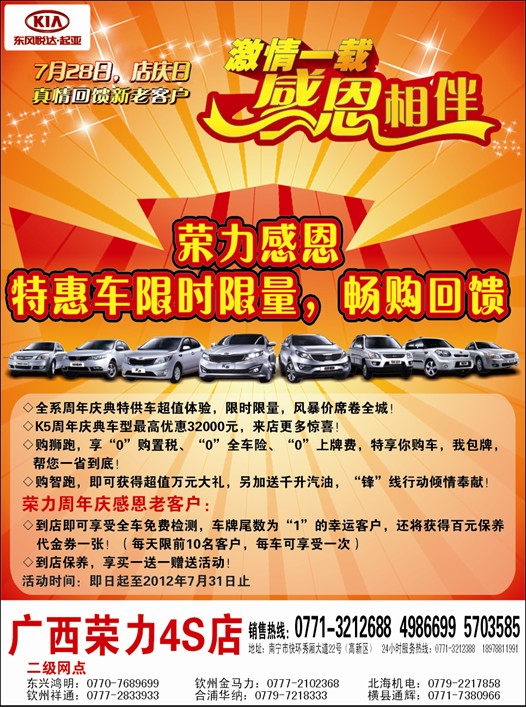 廣西榮力汽車銷售服務(wù)有限公司則是東風(fēng)悅達(dá)起亞汽車在廣西的A級(jí)專營(yíng)店,經(jīng)營(yíng)的汽車產(chǎn)品有:宣揚(yáng)時(shí)尚個(gè)性之風(fēng)的SOUL秀爾,以簡(jiǎn)潔、新銳為全新設(shè)計(jì)理念的FORTE福瑞迪,樂享歐式魅力風(fēng)尚的塞拉圖,兼具城市與越野性能、具有時(shí)代氣息的都市SUV獅跑,銳力之車的RIO銳歐,以及精英格調(diào)新典范K5等系列車型。