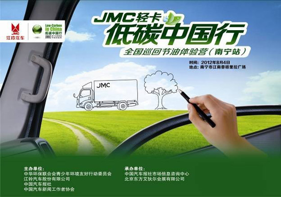 廣西江鈴作為第17站,將于8月4日在南寧市星光大道江南香格里拉廣場舉行JMC輕卡低碳中國行南寧站公益活動啟動儀式,該活動由中華環(huán)保聯合會青少年環(huán)境友好行動委員會、江鈴汽車股份有限公司、中國汽車報社、中國汽車新聞工作者協會聯合主辦,旨在向業(yè)界推廣普及低碳環(huán)保的汽車生活理念,誠邀各位感興趣的江鈴車主朋友踴躍報名參賽。