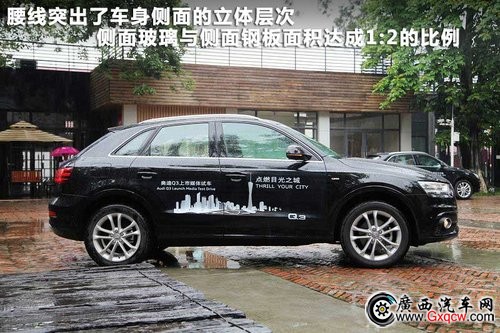 作為奧迪家族設(shè)計特征的“旋風(fēng)線”突出了車身側(cè)面的立體層次,與行李廂線條相連后形成了環(huán)繞車身四周的連貫線條,這使奧迪Q3不論是在靜態(tài)還是動態(tài)都表現(xiàn)出強(qiáng)烈的動感魅力。奧迪Q3的動感還體現(xiàn)在側(cè)面玻璃面積與側(cè)面車身鋼板面積的比例上,1:2的比例是奧迪經(jīng)典的家族設(shè)計特征。