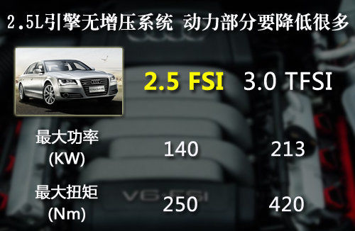 2.5L排量的發(fā)動機(jī)不僅僅在車型成本上有所減少,在消費(fèi)稅稅率上也有降低,F(xiàn)款A(yù)8L入門車型搭載的是一款3.0TFSI發(fā)動機(jī),起步售價在92.8萬,市場售價在80萬左右。若推出2.5FSI車型,其售價有望跌進(jìn)80萬區(qū)間,官方指導(dǎo)價僅75萬元。