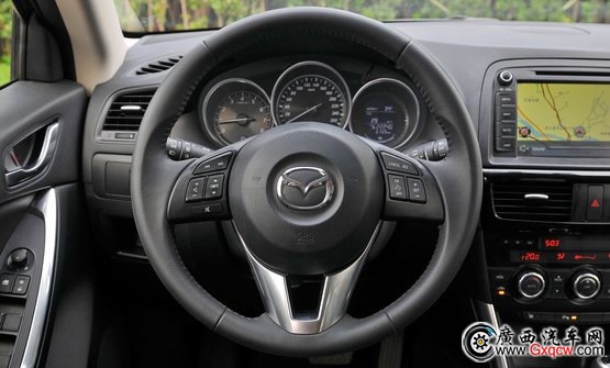 從造型上來(lái)看,馬自達(dá)CX-5的內(nèi)飾風(fēng)格與傳統(tǒng)馬自達(dá)的設(shè)計(jì)并沒(méi)有太過(guò)于明顯的差異。方向盤(pán)與傳統(tǒng)馬自達(dá)車(chē)型的基本上差不多,只是在做工上更為細(xì)膩一些,儀表盤(pán)也依然是我們熟悉的三炮筒式設(shè)計(jì)。方向盤(pán)的手感出色,尺寸也比較小,同時(shí)輪緣粗細(xì)也適中,在三點(diǎn)和九點(diǎn)方向還有專(zhuān)門(mén)的凹痕,依然是適合駕駛操控的設(shè)計(jì)。