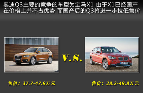 奧迪與寶馬同為豪華品牌,而Q3的上市使的奧迪在這一領(lǐng)域有了與寶馬X1相抗?fàn)幍能囆,填補(bǔ)了之前產(chǎn)品線的空白。寶馬X1已經(jīng)進(jìn)行了國產(chǎn),使得在售價(jià)上非常具有競爭力,而Q3明顯無法與X1相比,雖然排量相同,但價(jià)格上的過多劣勢明顯。為了使Q3更好的與X1競爭,只有國產(chǎn)后進(jìn)一步拉低價(jià)位,才能使Q3有著更好的競爭力。